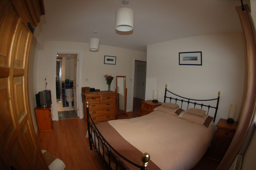 The master bedroom in our self catering luxury apartment has been tastefully decorated in cream and blue, this double bedroom has ample storage for clothes. The bedroom comes complete with a television and also an en-suite bathroom with wash hand basin, toilet and modern shower |