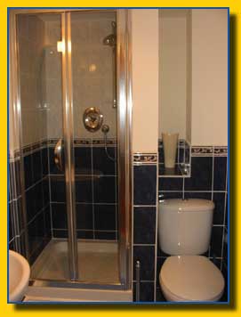 The master bedroom in our self catering luxury apartment has been tastefully decorated in cream and blue, this double bedroom has ample storage for clothes. The bedroom comes complete with a television and also an en-suite bathroom with wash hand basin, toilet and modern shower |